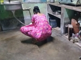 Tamil wife taking bath in the kitchen
